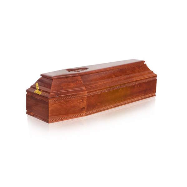 Это традиционный деревянный гроб, выполненный из массива сосны. Он имеет классическую четырёхгранную форму.